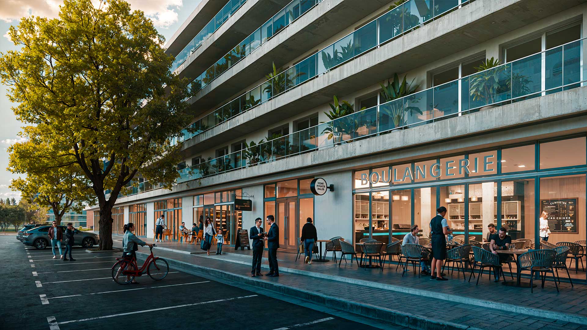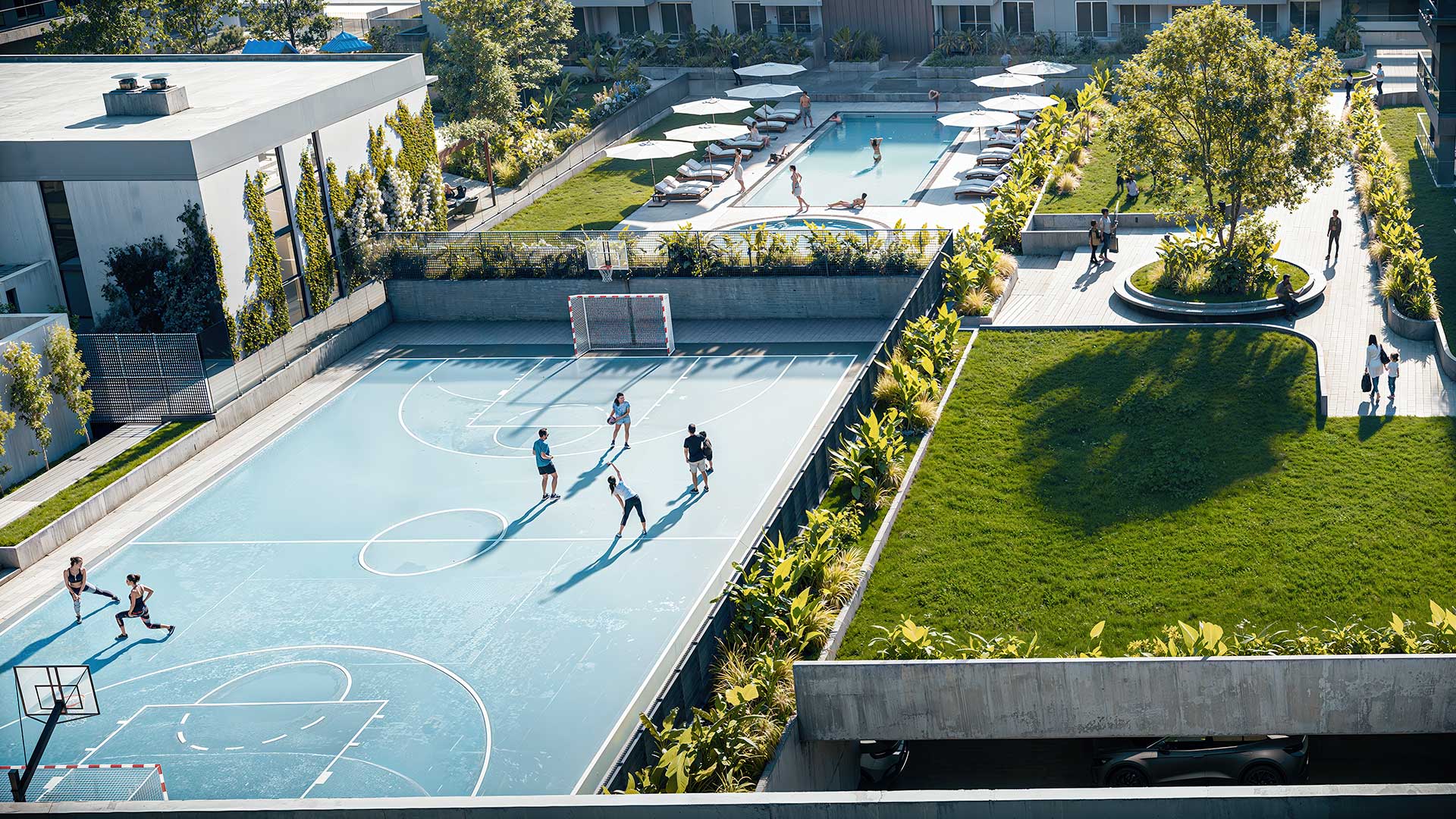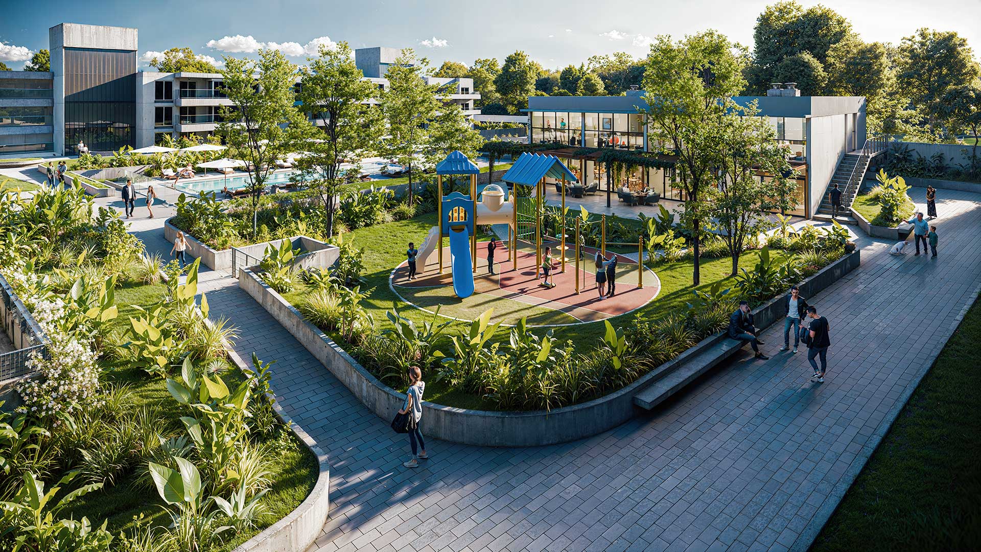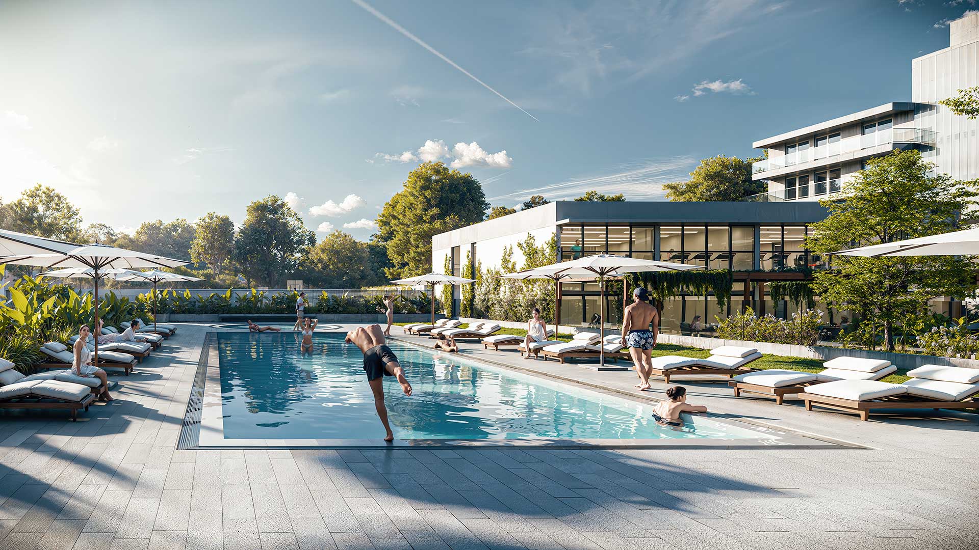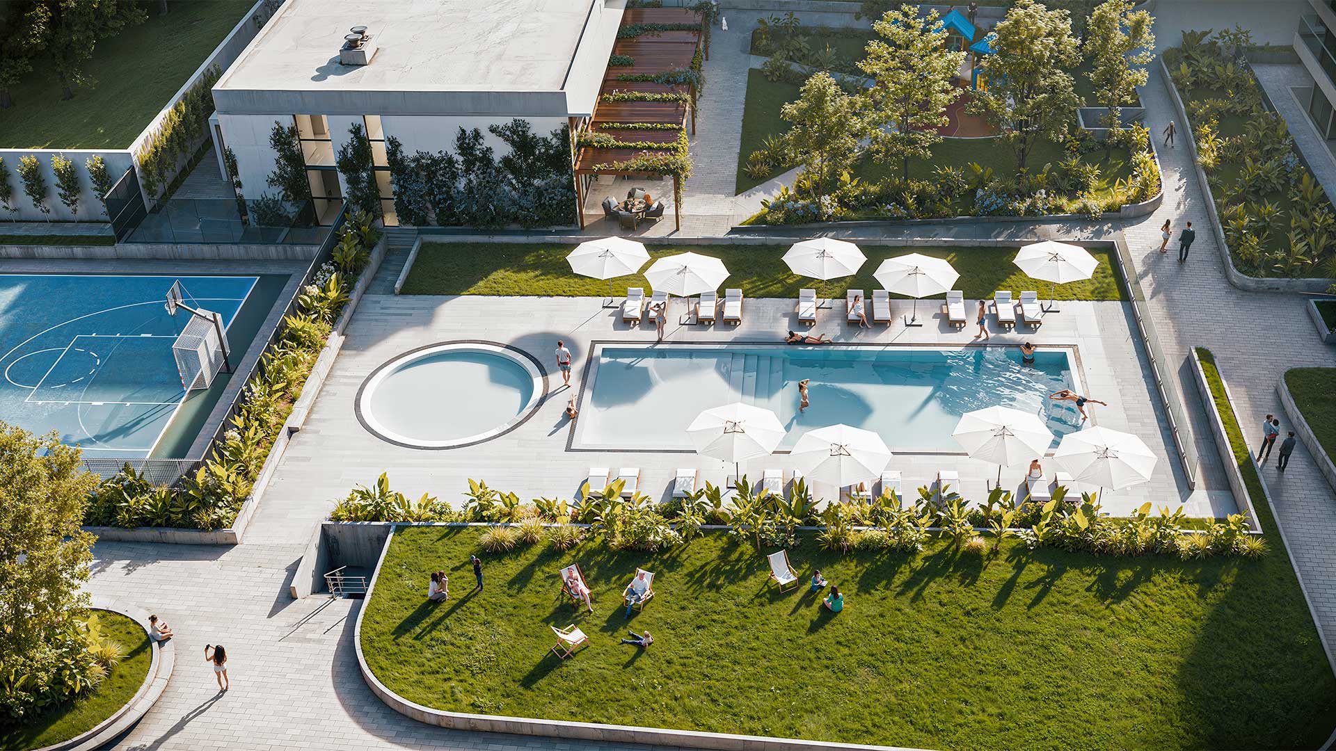 La primera etapa del proyecto consiste en la construcción del módulo ubicado sobre Av. Eva Perón con 56 departamentos de 1, 2 y 3 dormitorios, locales comerciales de doble altura en la planta baja, cocheras y espacios para motos y bicicletas. Todo esto se encuentra vinculado a un área central de uso común de 2900m2 con senderos parquizados, vegetación arbórea autóctona, piscina para adultos y niños, solárium, un playón deportivo y amenities desarrollados para este emprendimiento.